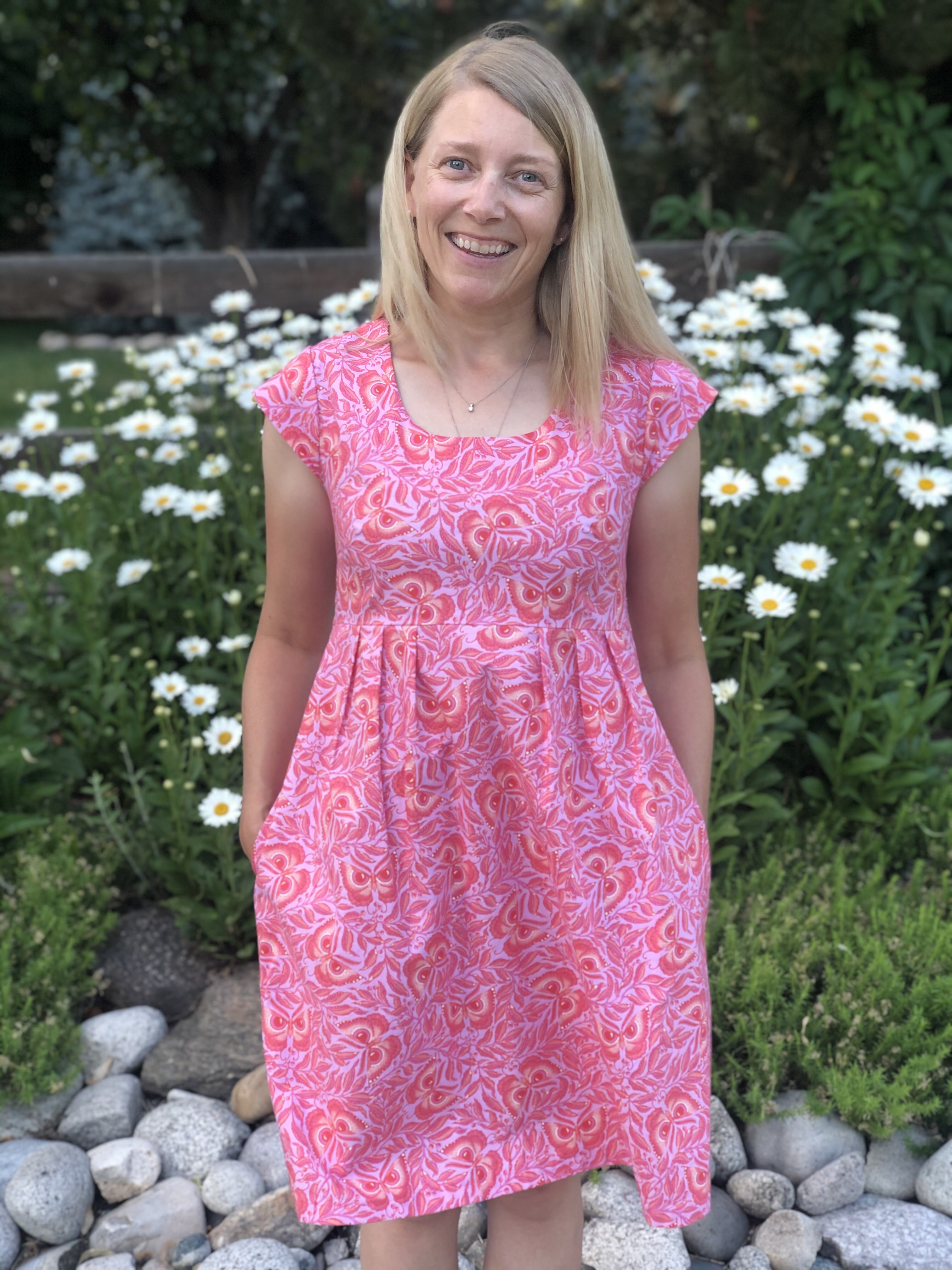 The Trillium Dress is an easy and quick make to add to your summer wardrobe, and the addition of the shirring (not as scary as I thought it would be) gives you an extra skill to add to your sewing arsenal. The instructions are very easy to follow, with tips on the shirring as well as an on-line tutorial on the made-by-rae website. I found this great fabric with vintage sunglasses on it and gave it a go. The first dress bottom had to be re-done when I realized I had placed the sunglass pattern off centre. This would have driven me nuts, so I had to order more fabric (sigh), and start that bit again. But once I got that right it was smooth sailing! The other point I would like to mention that I didn’t do on my second dress (not sure what happened) is that the last line of shirring should line up with your bodice piece so that it forms a line that wraps around the base of the bust and then around to your back (hopefully this makes sense). I left mine as is even though it isn’t perfect, as it isn’t that noticeable to anyone but me.
