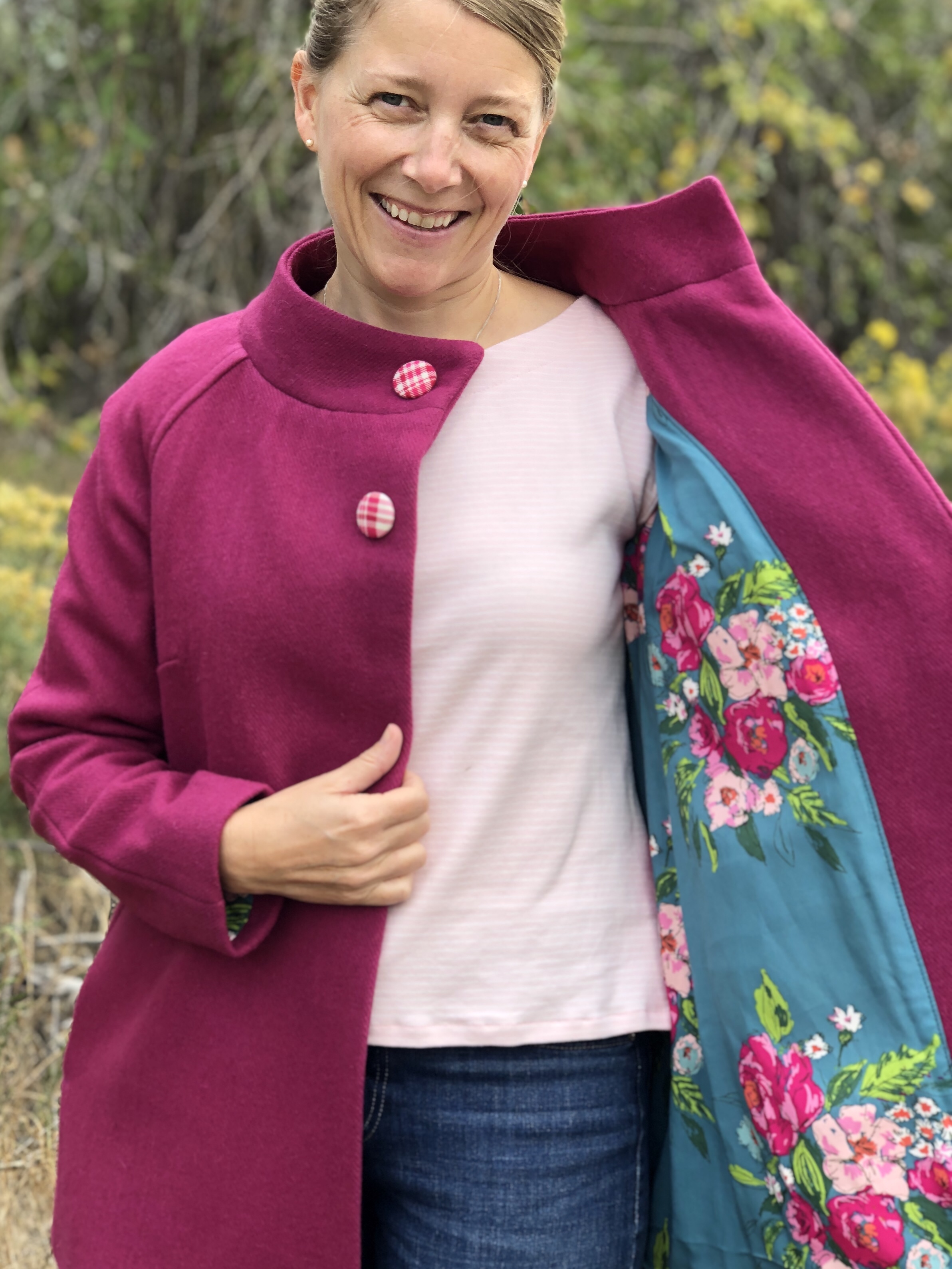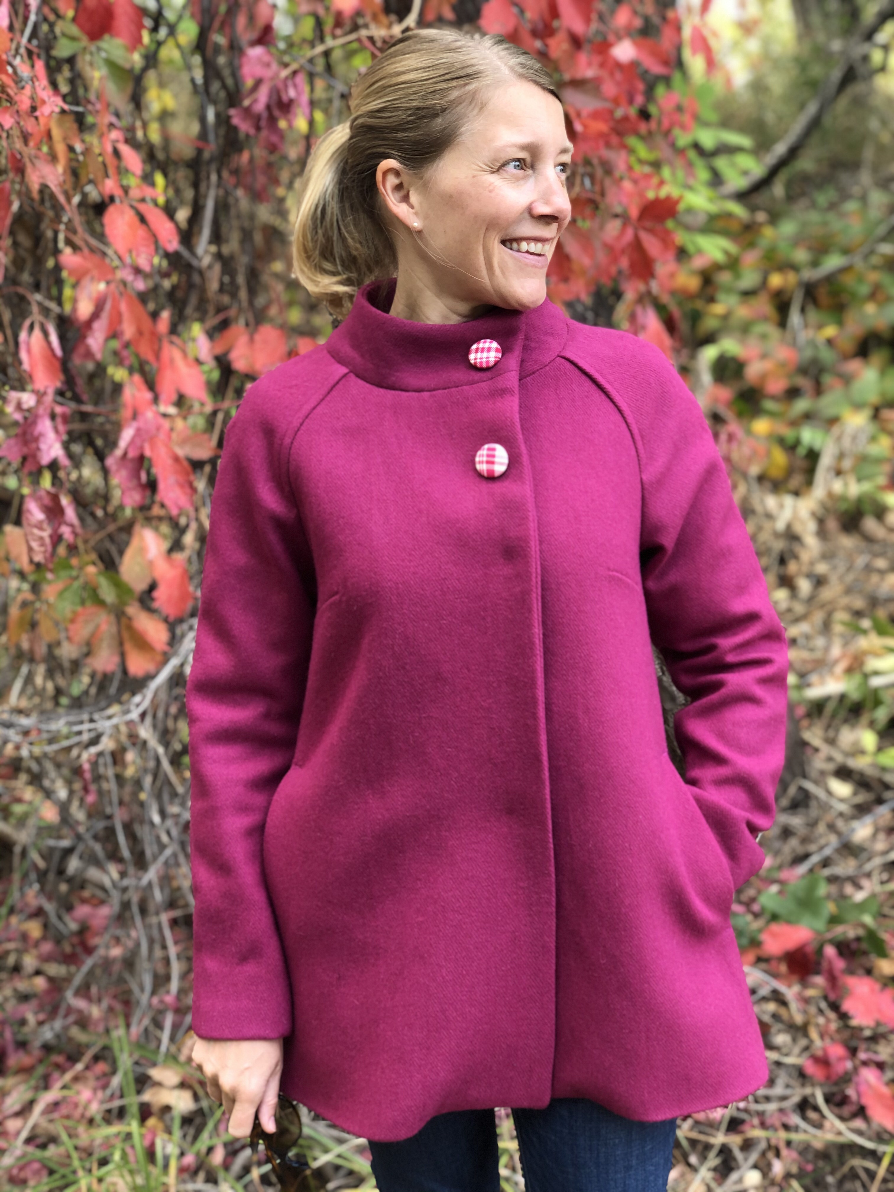 I had purchased a magenta wool a while back and figured that this pattern would be the perfect compliment to the bold bright wool. I LOVE working with wool, it really makes you feel like a super star professional sewer. I took a risk and ordered a rayon floral by Art Gallery fabric online for the lining. Thankfully the risk turned out great! The colours complimented the magenta beautifully. I went with snaps for a hidden closure and made the decorative exterior buttons out of some left-over fabric I had laying around to finish the 60s vibe I was going for.