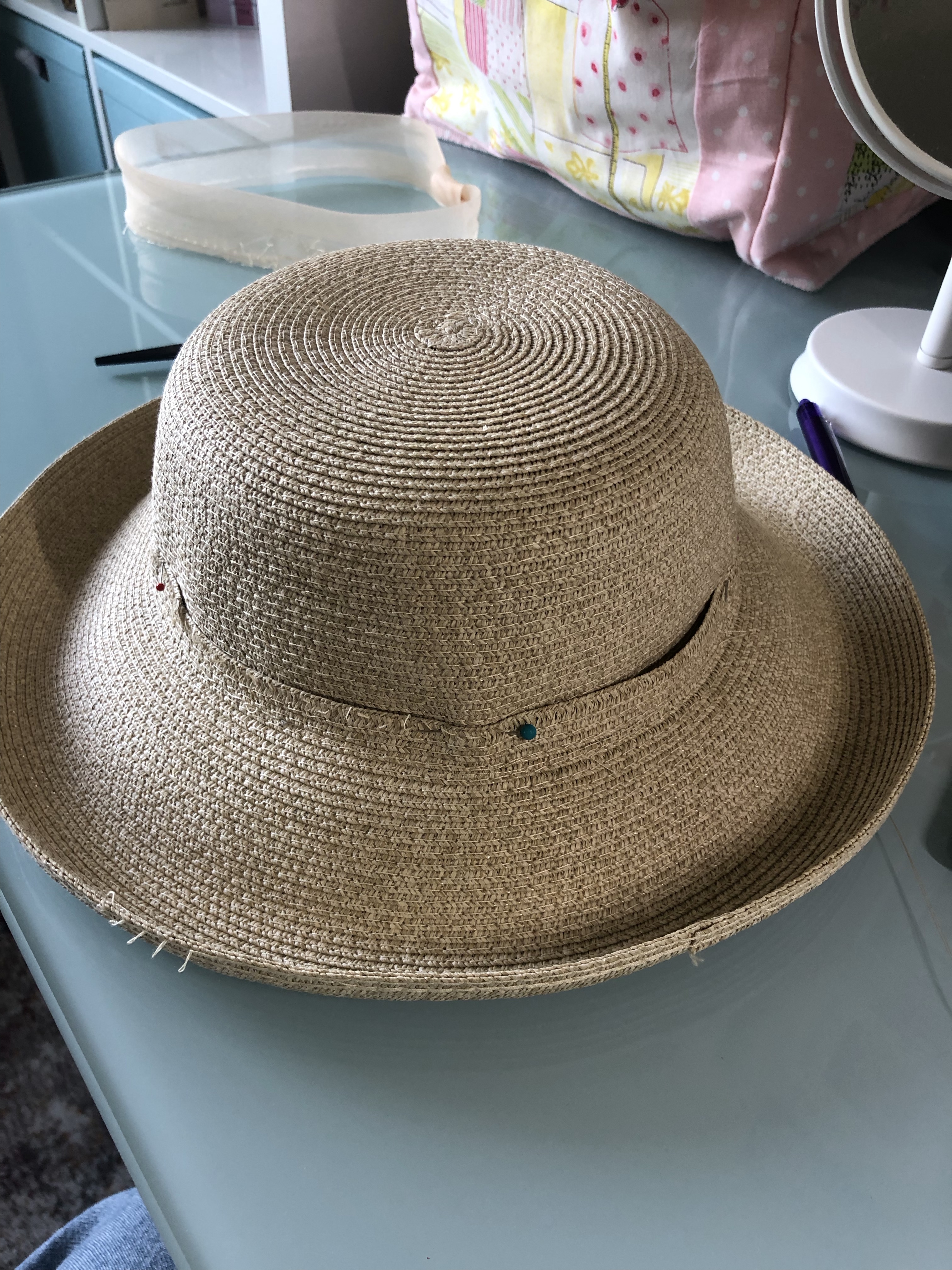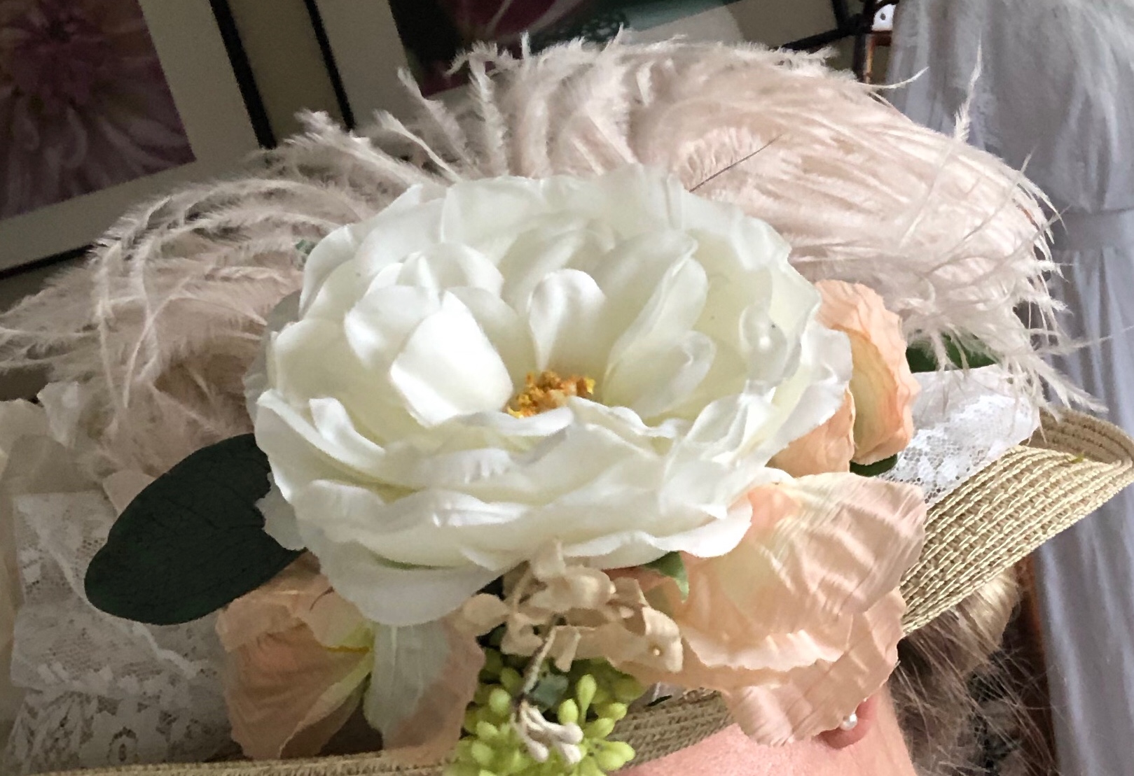 For the hat, I ordered a straw hat from Amazon.com and then cut into its stitches to remove some of the height. I stitched it back together once I was happy with the height. A thimble was really helpful here to push the needle through the straw. I then added lace, ribbons and fake flowers for decoration.