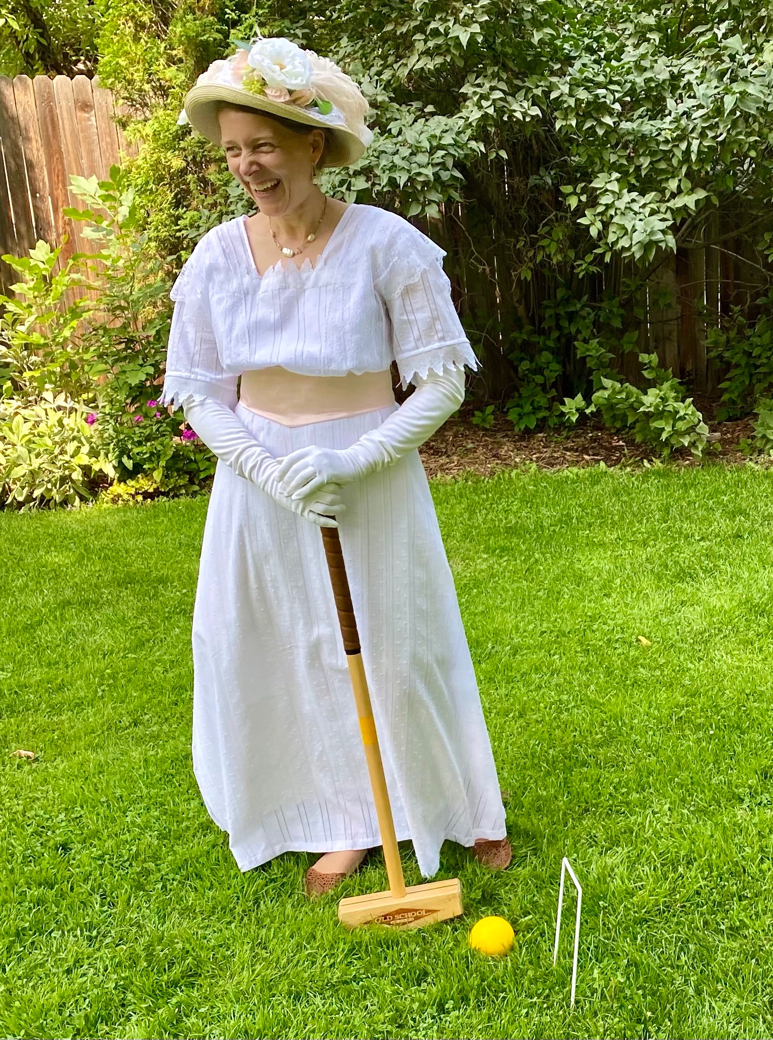 I kept to tradition in doing French seams and hand-stitched a lot of the bodice, including all the lace. I did cheat with adding snaps instead of hooks and eyes at the back as I wanted to be able to get into and out of it without help. I also made a chemise based on one I found on-line from 1910. I found a petticoat for $10 (yay!) at a vintage clothing shop.