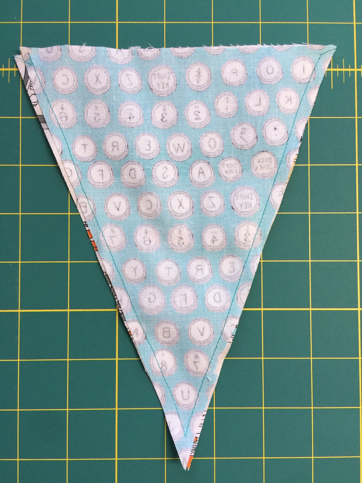 3. Lay two triangle pieces right sides together. If you are using a patterned fabric, make sure you are happy with the direction the fabric is going in – remember the shorter end of the triangle is the top of the bunting.