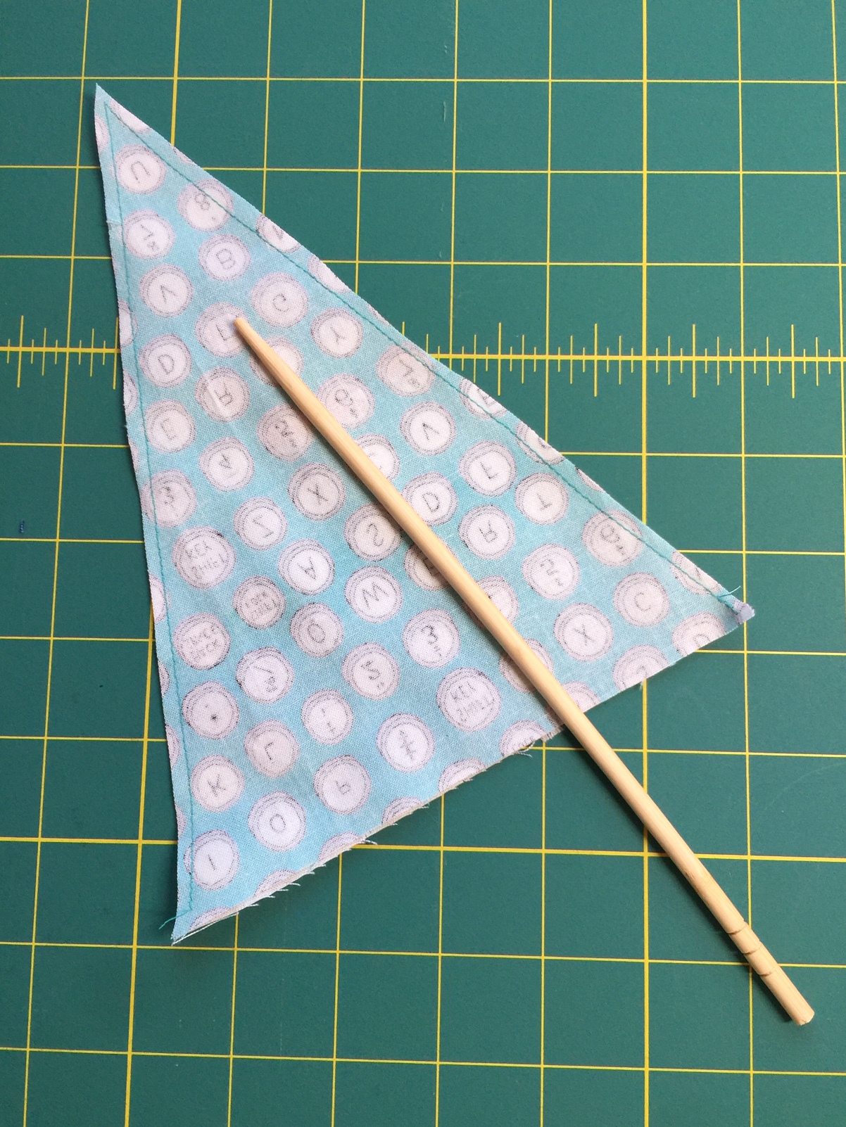 6. Turn the fabric triangle right side out and using a pointed tool (like a chopstick), push out the tip. Be careful not to push too hard and make sure your pointed tool is not too sharp – you don’t want to go through your stitches, you just want a nice neat point. Trim any excess thread. Press the triangle using your iron (steam and fabric spray can be handy here).