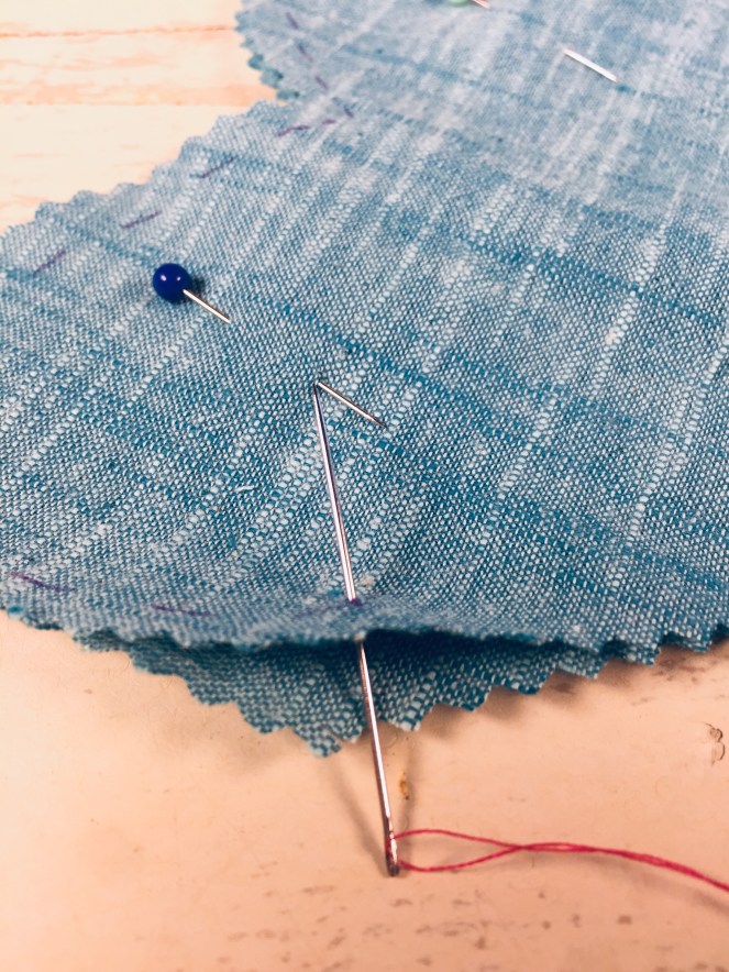 5. Next, thread your needle with your thread and tie off a knot at the end. It is a good idea to have enough thread on your needle to make it all the way around your heart so you don’t need to tie off and start again. You will be using a basic running stitch here. All this means is that you with either knot your thread or back stitch a few times to lock your first stitch in place. Do this between the two pieces of fabric (this will enable you to trim your thread but not have it visible on the exterior of the heart). Make sure the thread is secure with the knot, but do not pull through too much or it will come all the way through your piece of fabric. For Kiddos: If you are new to this, have an adult help you with this part. Bring your needle through the fabric from the back (wrong side), in this case from between the two pieces of fabric. Make a stitch to the left or the right, this time going through both layers of fabric. Bring the thread back up to the top of the heart and then repeat in evenly spaced stitches (or as close as you can).