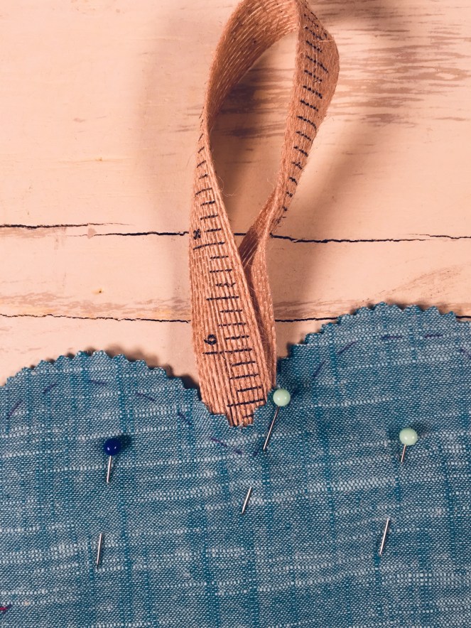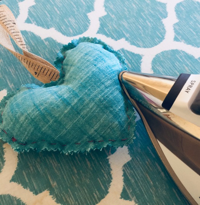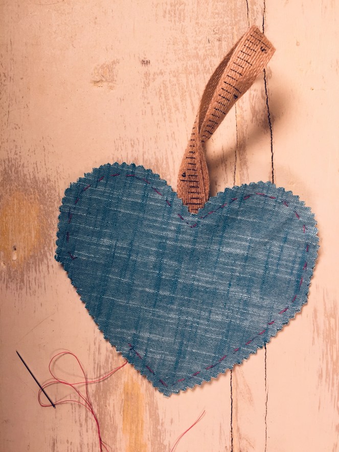 3. Take your ribbon and fold it in half and tuck around 1” of both raw ends into the top and centre of your heart in between the two pieces of fabric so that the ends are hidden. Pin or stitch them in place.