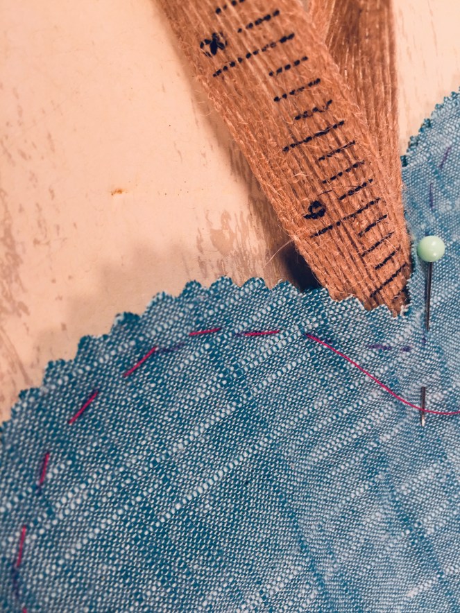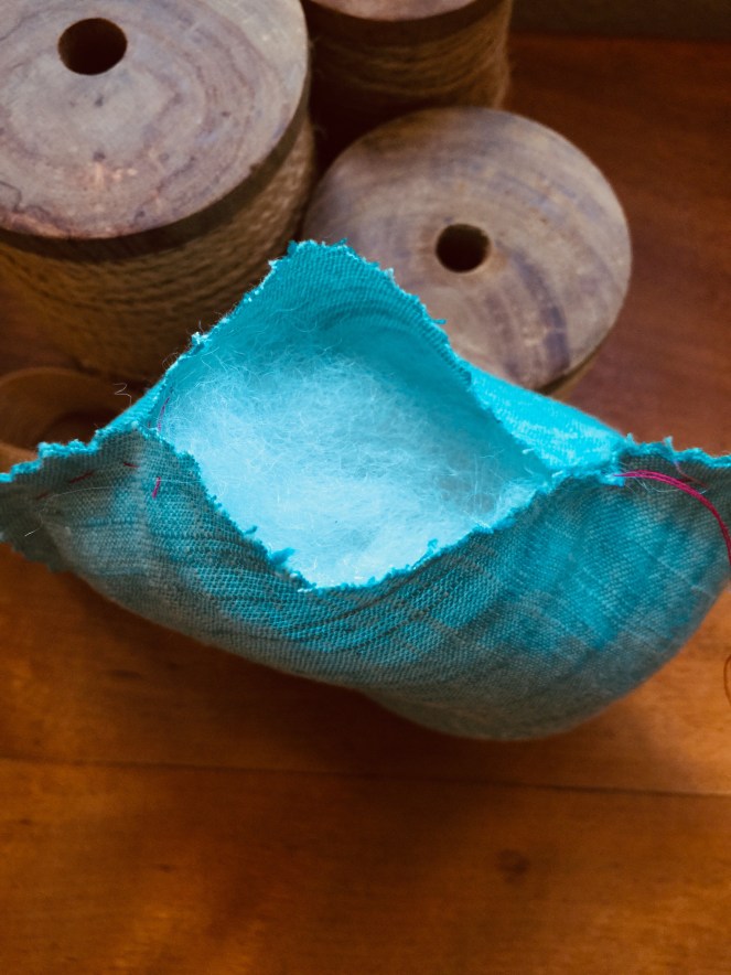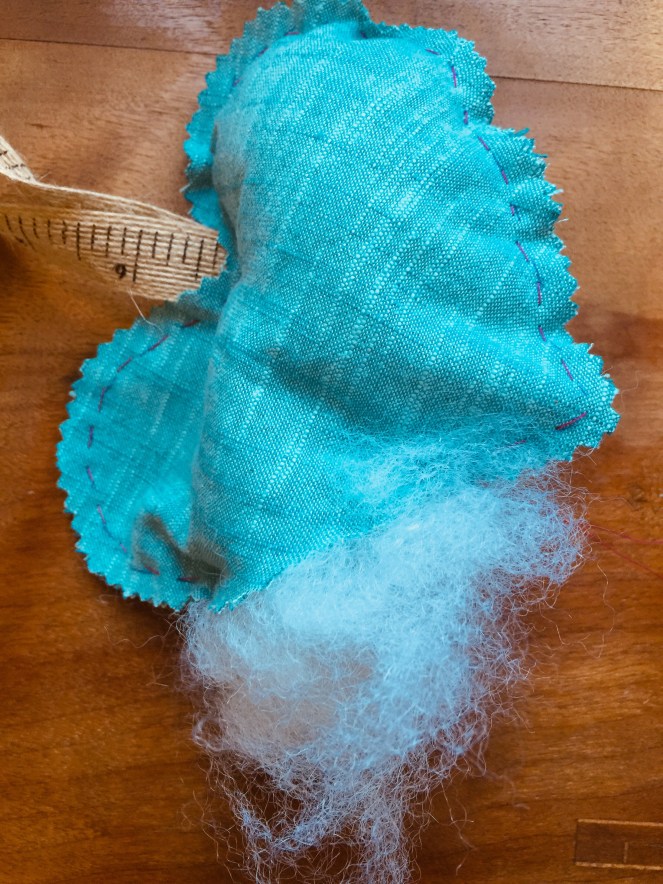 6. You want your stitches to be decorative, so as you stitch try to stay at around a ¼” from the outside edge and keep your stitches as neat and evenly spaced as possible. Make sure to secure your ribbon well with these stitches. Also, ensure that you leave about a 2” opening for your stuffing to go into. It is easier to have this on one of the sides rather than at the top rounded bit or at the point. Start your stitches at one end of the 2” opening and end at the other. Be careful not to pull your stitches too tight as you want your fabric to lay flat rather than bubble. Don’t forget to start and stop leaving a 2” opening.